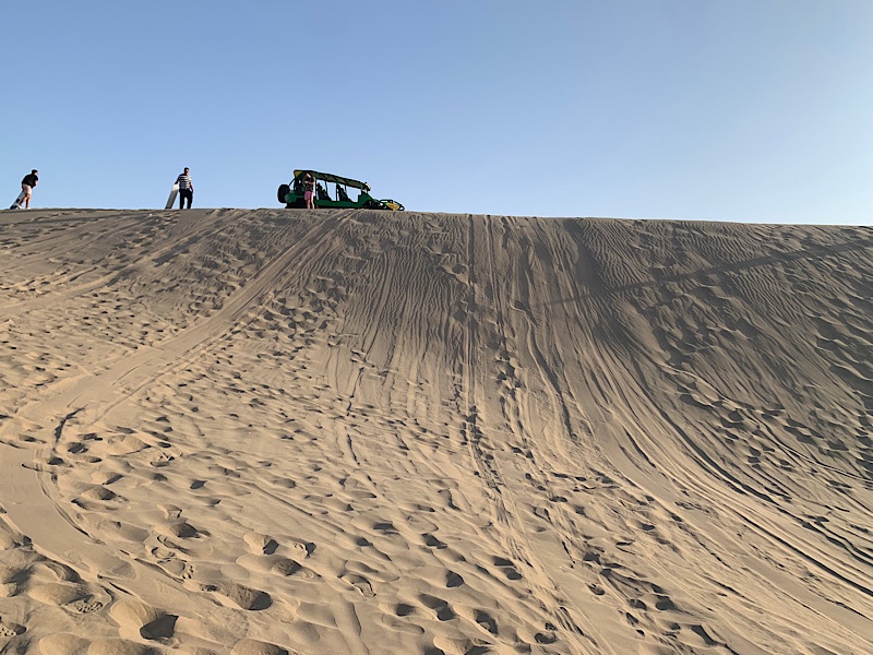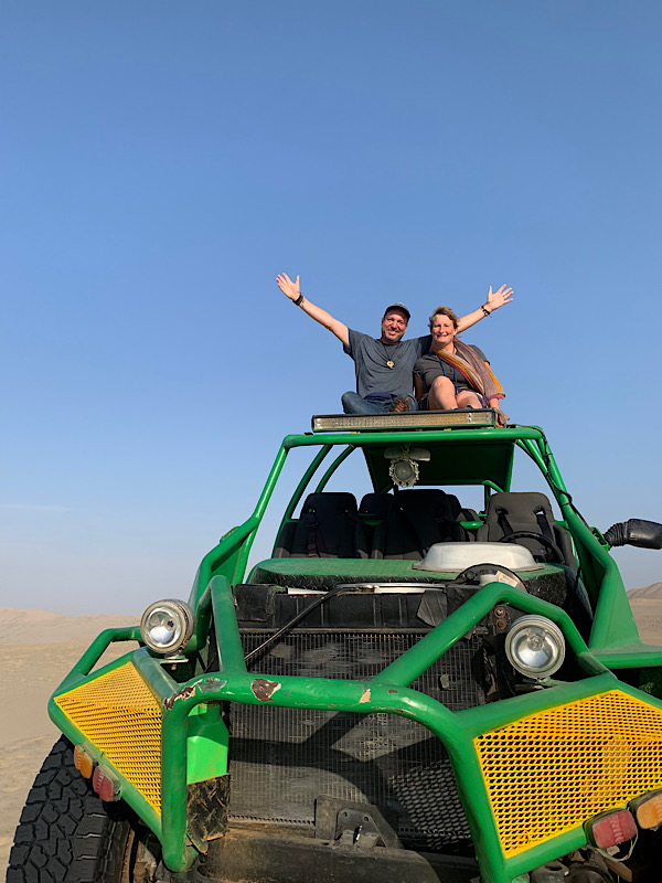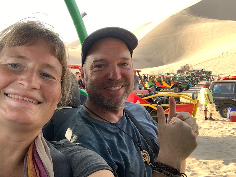Eigentlich wollten wir kein Buggy fahren, aber die Frau, die unser Gepäck aufbewahrt macht uns ein verdammt gutes Angebot im Buggy mit den Franzosen, die wir schon in Paracas kennengelernt haben. Und so brettern wir vor Abfahrt unseres Busses durch die Wüste. Ute als vereidigte Kreischbeauftragte sorgt für Stimmung an jeder Düne.