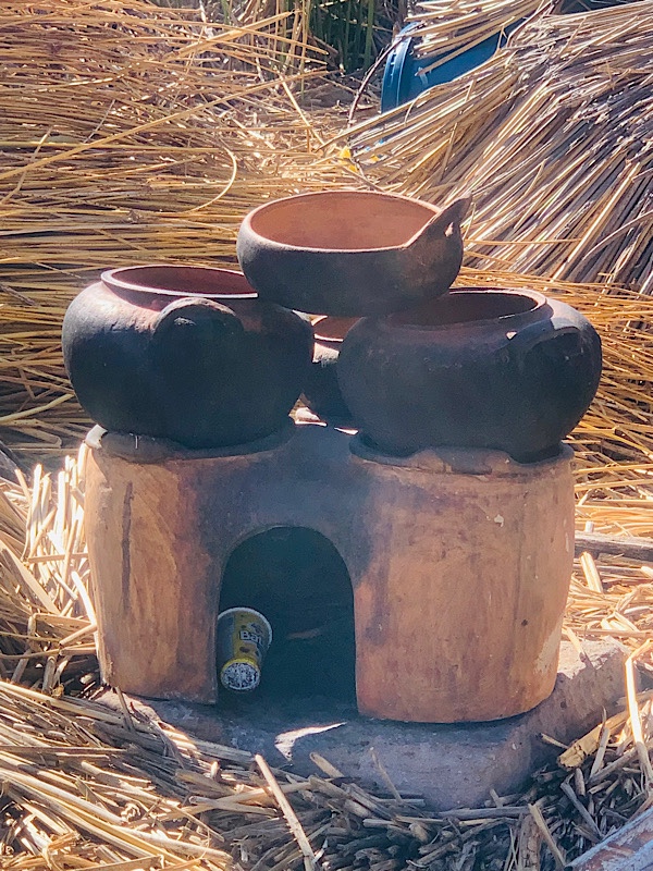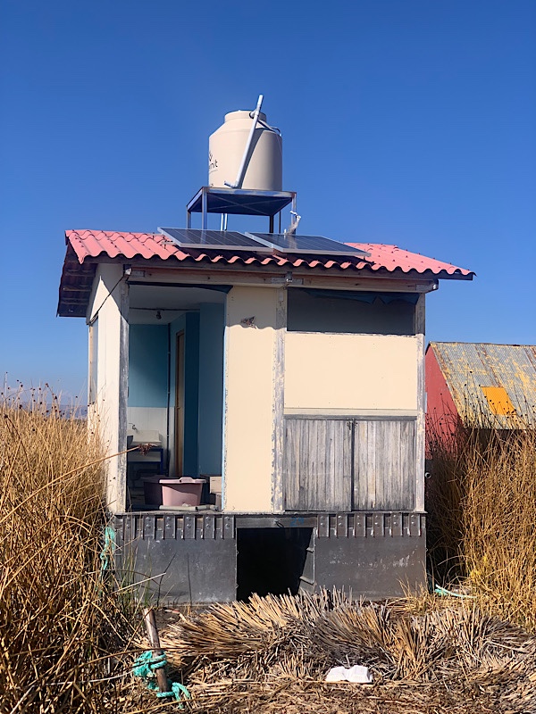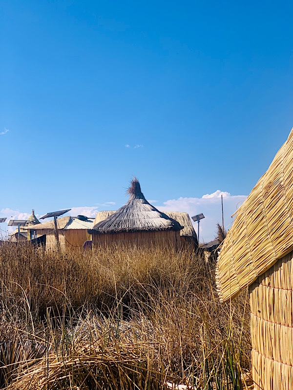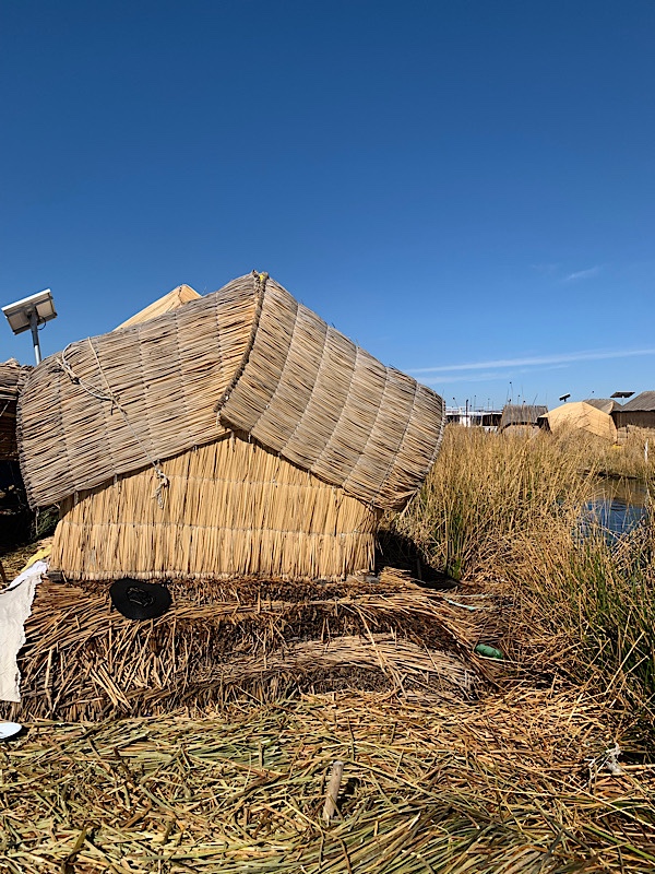 Wir besuchen eine Insel, bekommen eine kurze Einleitung und sind erstaunt, dass das was schwimmt gar nicht das Schilf ist, sondern eine untere Schicht aus … wir haben es nicht ganz verstanden … Erde?. Die wird mit Pflöcken im Boden verankert, um nicht nach Bolivien abzutreiben. Nur oben drauf werden in verschieden Richtungen Schilf gelegt, so dass das ganze durch Reibung zusammenhält. Die Bewegungen auf dem Wasser nimmt man fast gar nicht wahr. Für die Touristen gibt es noch Hütten aus Schilf. Viele andere Häuser sind aus moderneren Materialien.