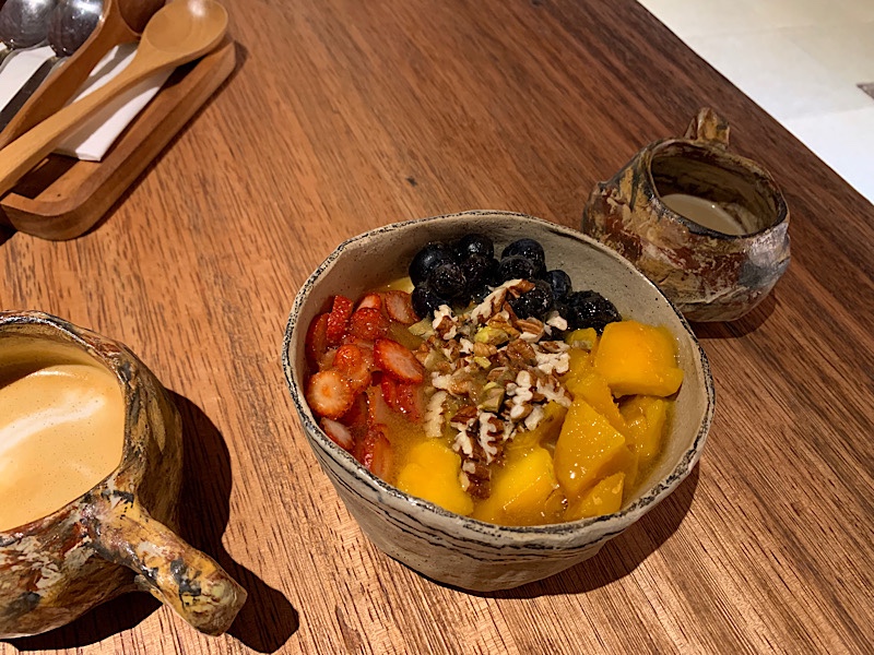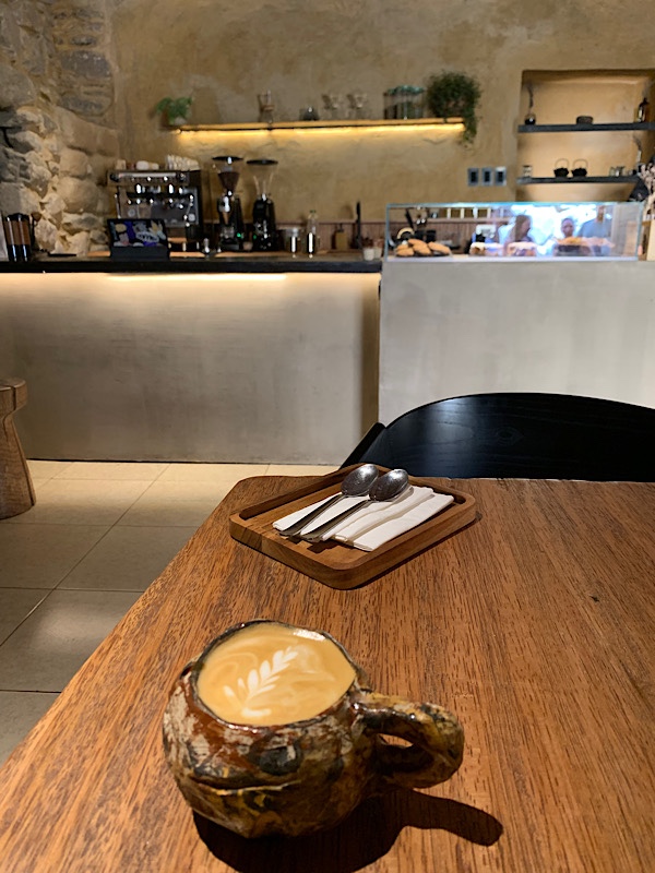 Und siehe da: Wir finden ein recht neues Cafe, mit einem schöneren Lichtdesign, einem super nettem Team, mit dem wir ins Gespräch kommen. Außerdem haben sie günstige, leckere griechische Joghurtbowls mit Früchten. Allein die Tassen aus der örtlichen Töpferei sehen aus wie vom Kindergarten getöpfert. Aber es schmeckt.